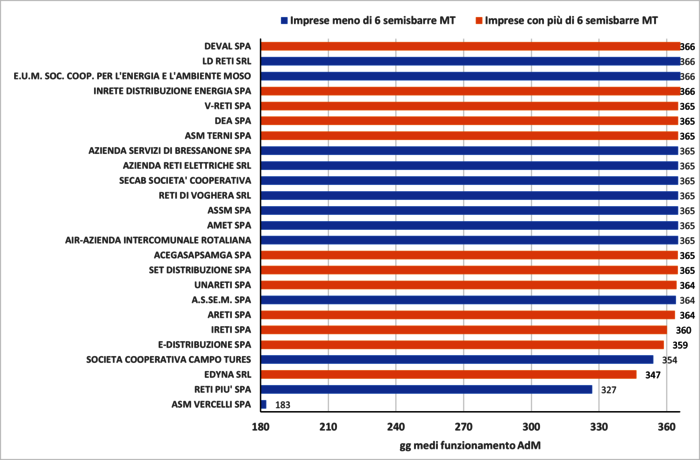 Nel grafico è rappresentato, per ciascuna impresa distributrice, il numero medio di giorni con AdM correttamente funzionanti.